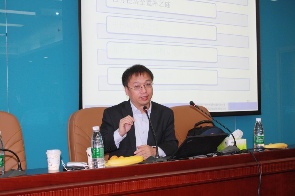 讲座中,甘犁教授详细介绍了中国家庭金融调查(CHFS)的数据搜集过程,从问卷设计、踩点抽样到质量控制、电话访问,甘教授面面俱到,将CHFS数据搜集工作的全貌展现给了在场师生,同时,也让大家充分认识到了CHFS调查工作背后的艰辛与努力。甘教授提到,从2009年开始尝试全国大范围访问至今,通过数据搜集以及不间断地长期维护,CHFS详尽地记录了我国家庭的资产与负债、收入与支出、保险与保障等方面的微观信息及其变动情况,实现了对我国家庭金融动态行为的全面追踪。之后,甘犁教授结合国家统计局的相关数据与CHFS数据进行了比较分析,为我们进一步阐述了“中国自有房空置率之谜”的内涵——为什么我国城镇化工作开展城镇人口住房需求增加的同时自有房空置率反而不断上升。为了帮助大家解答这一困惑,甘犁教授通过区分城镇化的两种内涵------“主动进城”与“被进城”,结合对统计局城镇编码变化和需求差异(刚性需求与改善型需求之间的差异)的深入分析,指出“被进城居民明显多于主动进城居民”、“不区分两类进城居民导致住房需求被高估”、“对城镇化理解存在误区”等三个方面的原因共同导致了“自有房空置率之谜”。讲座最后,甘教授在上述分析基础上对2014年的各项住房新政效果进行了评估分析,提出了自己的见解。