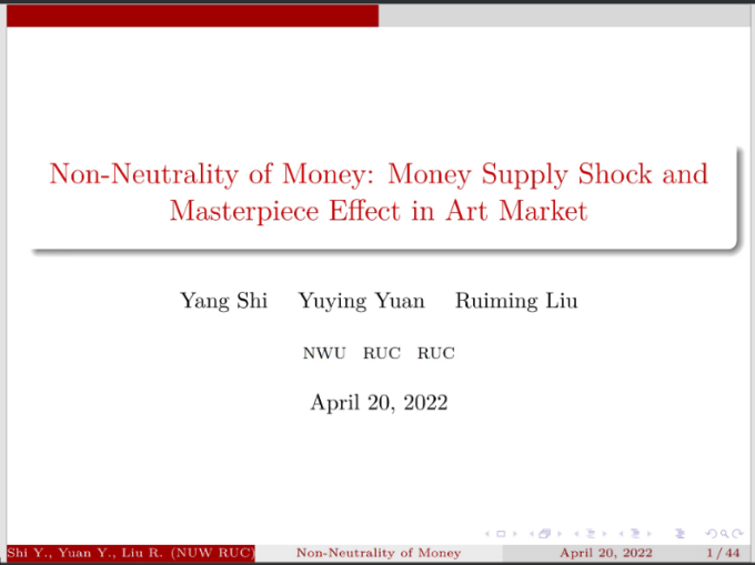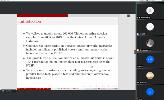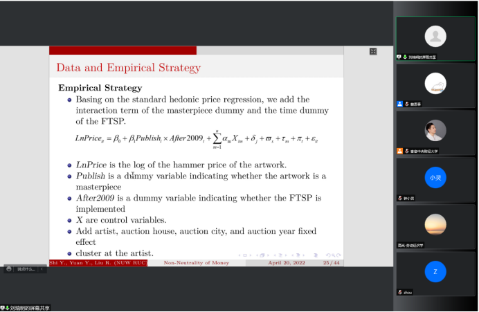 2022年5月12日14:00,中国人民大学国家发展与战略研究院教授、博士生导师刘瑞明应365英国上市集团邀请,开展主题为“Non-Neutrality of Money:Money Supply Shock and Masterpiece Effect in Art Market”的讲座,本次讲座通过腾讯会议平台线上举行,刘瑞明老师受到了老师和同学们的热烈欢迎!365英国上市集团黄乃静副教授主持了线上学术交流会,陈斌开院长、尹振东教授与2020级博士生共同参与了本次学术交流。