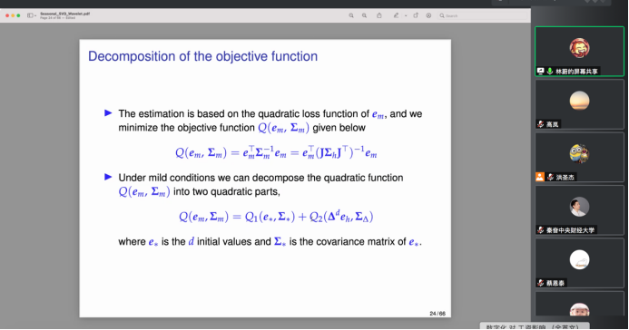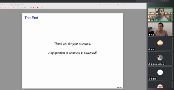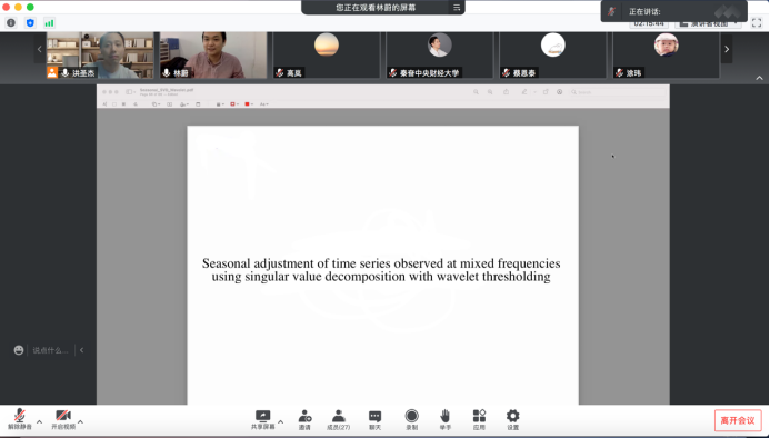 2022年4月27日,对外经济贸易大学国际经济贸易学院副教授林蔚应365英国上市集团邀请,开展主题为“Seasonal adjustment of time series observed at mixed frequencies using singular value decomposition with wavelet thresholding”的讲座,本次讲座于下午2点在腾讯会议线上举行,持续近两个小时。本次讲座由365英国上市集团黄乃静老师主持,洪圣杰老师和部分学生参加了此次讲座。