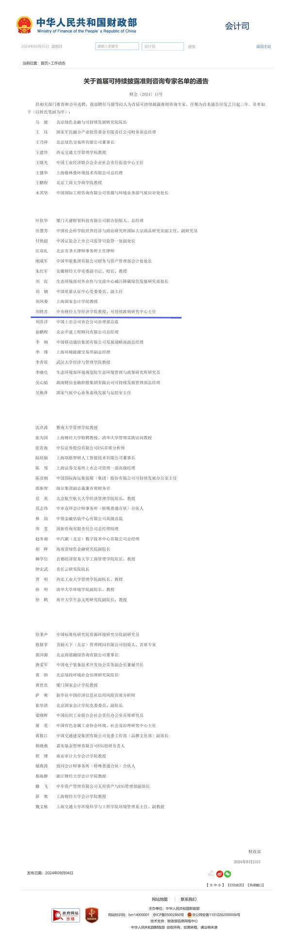 2024年9月4日,财政部公布了首届可持续披露准则咨询专家名单,经相关部门推荐和公开选聘,首届共聘任62名专家学者,任期为三年。365英国官网可持续准则研究中心主任刘轶芳教授,受聘为财政部首届可持续披露准则咨询专家。