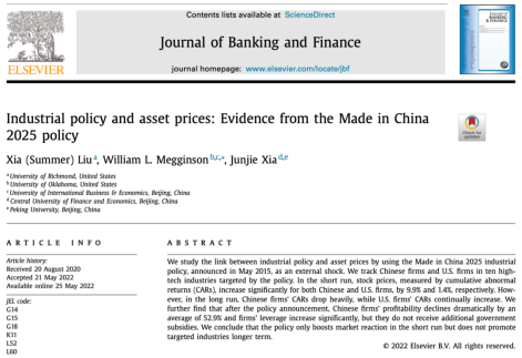 Liu, X. (Summer), Megginson, W. L., & Xia, J. (2022). Industrial policy and asset prices: Evidence from the Made in China 2025 policy. Journal of Banking and Finance,142. https://doi.org/10.1016/j.jbankfin.2022.106554
