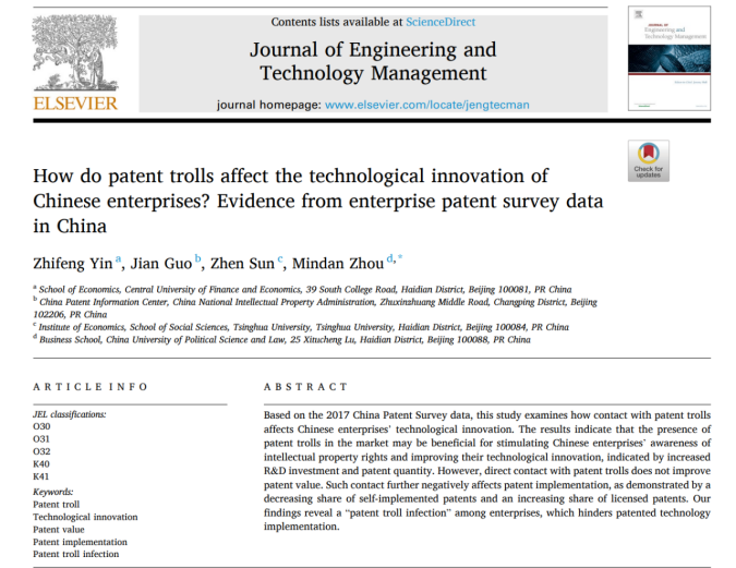 学术视点 | 365英国官网尹志锋老师的合作论文How do patent trolls affect the technological innovation of Chinese enterprises? Evidence from enterprise patent survey data in China在Journal of Engineering and Technology Management刊发