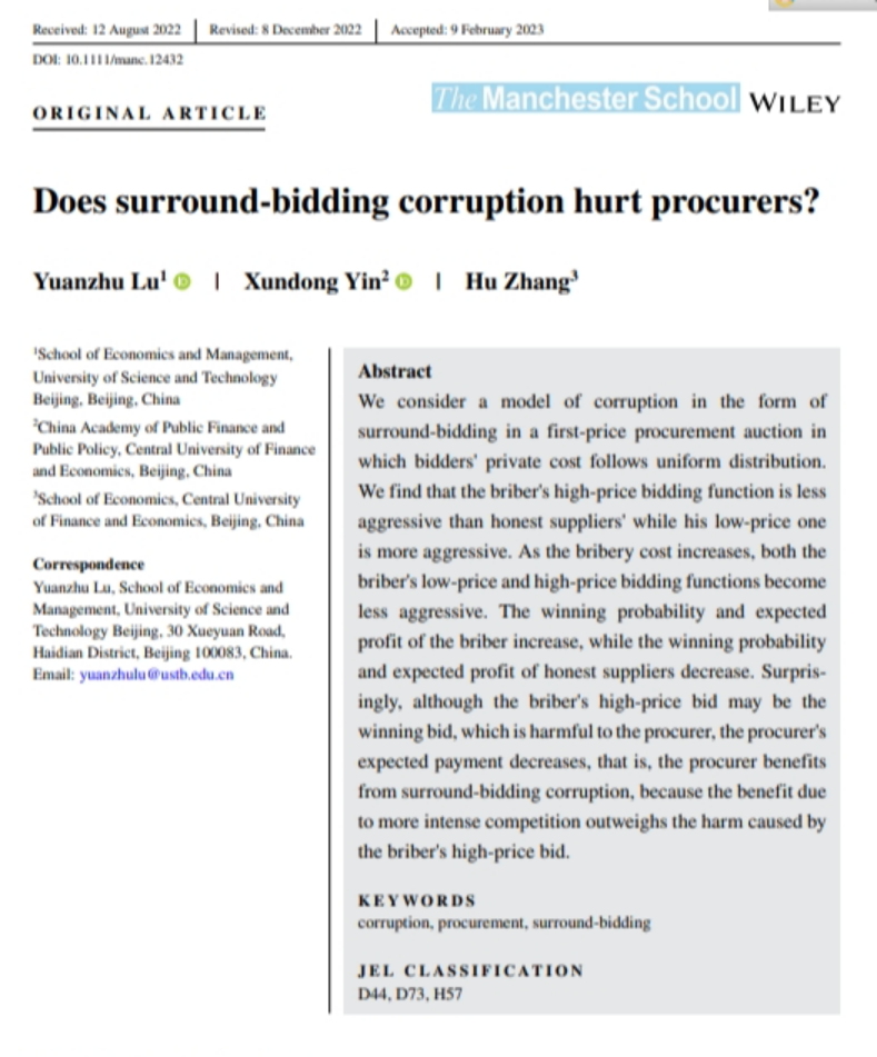 学术视点 | 365英国官网张琥老师的合作论文《Does surround-bidding corruption hurt procurers》拟在The Manchester School发表