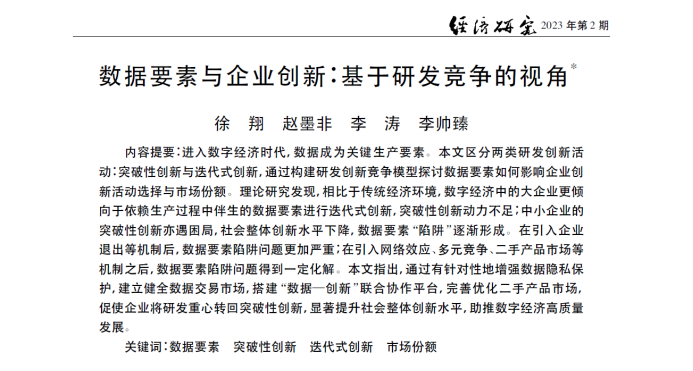 徐翔、赵墨非、李涛、李帅臻:《数据要素与企业创新:基于研发竞争的视角》,《经济研究》,2023年第2期。