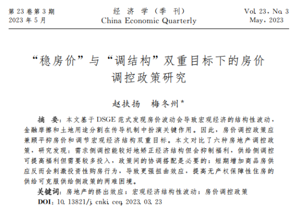 赵扶扬、梅冬州:《“稳房价”与“调结构”双重目标下的房价调控政策研究》,《经济学(季刊)》,2023年第23卷第3期。DOI:10.13821/j.cnki.ceq.2023.03.23.