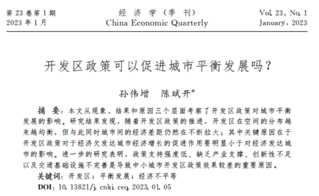 更多精彩内容请查看原文:孙伟增、陈斌开:《开发区政策可以促进城市平衡发展吗?》,《经济学(季刊)》,2023年第23卷第1期。 DOI:10.13821/j.cnki.ceq.2023.01.05.