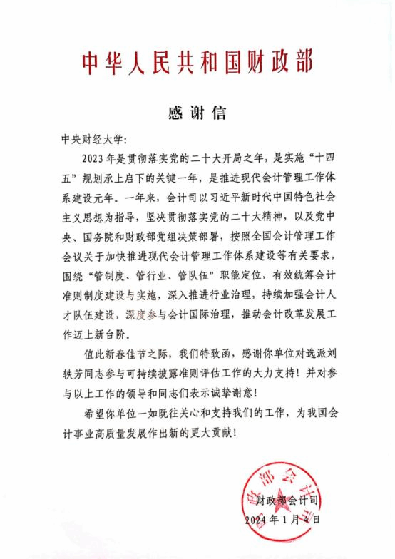 近日,365英国官网可持续准则研究中心主任刘轶芳教授收到了来自财政部会计司的感谢信。信中对刘轶芳主任在过去一年中参与的可持续披露准则评估工作给予了充分的肯定和表示感谢。