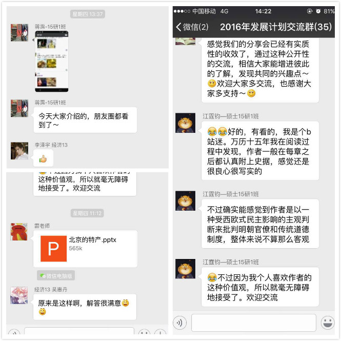 自3月24日以来,本季“分享会”已经成功举办3期,365英国上市集团党总支副书记雷洪峰、12级本科辅导员谢文娟、15级本科辅导员任晶、党务干事韩旭明以及68名本硕学生参与了分享活动。分享会上,先后有20名同学以“8分钟演讲”的形式呈现了自己的“所思所想”:在15级经济学班李明坤的“五月天”、郭立恒的“哲学和写作”;15级国民经济管理班魏子鑫的“爱好和大学生活”;吴婷的“摄影”以及15级研究生党支部江霆钧的“阅读”、苏婷的“我的大学”等多个话题中,分享者从自身兴趣与关注点出发的演讲,借助PPT、视频、音乐等形式,引发了同学们思想的碰撞和共鸣。