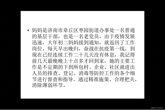 在看“疫”环节中,党员通过分享自己身边的抗“疫”事迹和暖心故事,一起守望相助,爱心接力。潮力亚的父亲作为一名老党员,在疫情期间排除万难,全力保障社区的口罩等物资供给;张小璇的母亲担起社区工作者的责任,挺身前线奔赴“社区隔离防控战”;刘西凤以当地大学生党员志愿者为例,分享疫情困境下青年一代的担当与作为;谢昭冬更是以参与武汉方舱医院通讯工程的表哥为例,为同学们捕捉多个奋战一线的感人镜头。一个个医护人员、基层工作者、后勤工人真真实实地存在于我们身边,或感动或铿锵的故事澎湃了大家的内心,坚定了抗“疫”必胜的信心与决心。