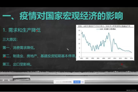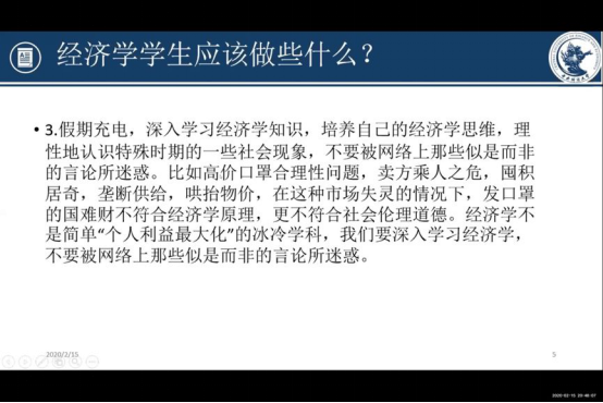 学贵有思,同心共振。在问“疫”环节,支部特别邀请了教师党员与同学们进行在线交流。经济学专业教师伏霖分别从疫情对经济的影响、疫情期间的社会经济现象、疫情对制度和观念的影响等方面提出了自己的思考,就同学们关心的经济学问题进行了耐心的解答。同时,对同学们进行关怀,希望大家做好防护工作,在家认真学习,锻炼身体。