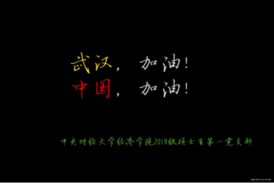 活动最后播放了支部党员为抗击疫情的战士们加油打气的视频。视频中,“武汉加油!中国加油!”的口号铿锵,一如前线战士们舍生取义的眼神如炬。大家同心共济,众志成城,为共同打赢这场防“疫”抗“疫”的阻击战贡献力量!