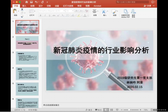 在思“疫”环节,大家立足专业、学思结合。充分利用专业经济学知识分析疫情带来的影响,表达了经济学人对于疫情的深入思考。陈兰荣、郑立晨、林映吟从经济学角度出发,研究疫情对中国宏观经济的影响,分析对我国交通运输业、旅游业、娱乐文教行业、零售行业的冲击与挑战;温以萍以“口罩价格问题”为切入点,针对疫情期间供需价格问题进行深入分析;宋林秋、雷敏从社会主义制度优越性展开论述,为疫情之下经济学人该如何作为提出建议。支部党员在思想交流中实现了理论与实践的结合,夯实了专业理论研究,强化了经济思维与批判思考的能力。
