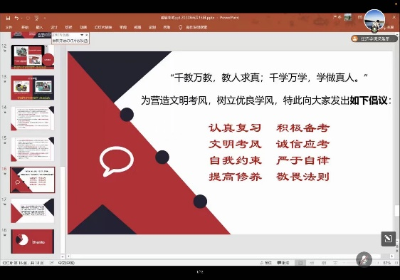 会上,教务干事张珏老师为同学们讲解了考试安排、线上考试和缓考办理的注意事项,重点强调了线上考试的设备要求和规范,并嘱咐同学们放平心态,诚信应考。纪委委员、学工办主任梁延东老师详细介绍了《英国365上市公司官网学生管理规定(修订)》中有关考试违纪方面内容,从违纪处分的类型、处分期限、处分程序,到考试违纪处分的细则,严肃提醒同学们考试违纪行为得不偿失,文明考风,诚信应考。