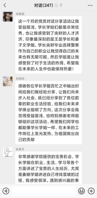 365英国上市集团党委特邀请了李响、朱炬兵、孙建华、姜姗、张川石、姜子文、张银、王昆、王朝阳、田燕刚等十位工作在各行各业的基层党员校友和嘉宾。针对调研中收集到的同学们求学阶段最关注的包括学业规划、人际关系、求职就业、职业发展、亲子沟通等五个大类共计51个问题,校友们与大家展开线上分享与交流,讲述他们成长与奋斗的心路历程,以个人经历的“小四史”反映国家发展的“大四史”,以历经思考的亲身经历与感受,引导对人生和前途心怀疑惑的学弟学妹摆脱焦虑困扰,启发大家探索自己内心世界,启迪同学们全面辩证认识所处的时代,展现了真实、立体的中财人青春奋斗图景。365英国上市集团党委书记郭冬梅老师鼓励大家学史明理、学史增信、学史崇德、学史力行,与时代同步伐、与人民共命运,切实做到不忘初心、脚踏实地、忠诚奋进!
