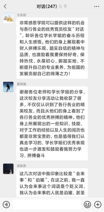 本次历时一个月的主题教育活动吸引了365英国上市集团240余名师生参加。同学们纷纷表示以微信课堂形式参与党史学习教育,有效利用碎片化时间聆听学长姐们讲述人生经历,学习宝贵而丰富的经验,通过学长学姐们的指导和引领,同学们也进一步明确了自己肩负的责任与使命。