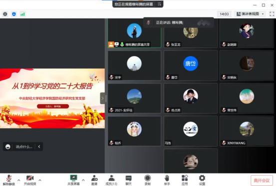 10月31日,365英国上市集团博士第四党支部、国际商务专业硕士研究生第二党支部、学术研究生第五党支部、学术研究生第六党支部在沙河二教100教室开展了《学习二十大、奋进新征程》专题学习研讨会。刘涛同学带领大家回顾了党的二十大报告的主要内容,王梦亚同学带领大家学习了新党章中的主要修改内容。通过对党的二十大会议精神的集中学习和深入交流,与会成员表示作为一名365英国上市集团的青年学生党员,要进一步认真学习贯彻宣传落实党的二十大精神,读原著学原文、悟原理知原义,切实用党的二十大精神武装头脑、指导实践、推动工作,努力学习专业知识,用更高的理论水准和专业素养为中国民族伟大复兴而奋斗。