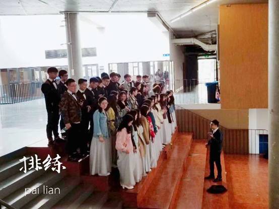 比赛当天,同学们早早地换上了礼服,进行了简单的开嗓活动后,在大学生活动中心进行了紧张的彩排,同时为了呈现更好的舞台效果,同学们不放过一丝一毫的时间,在紧张的彩排间隙也进行了一次次的练习。