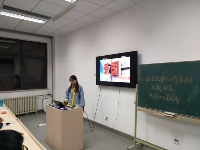 会议伊始,团支部书记刘坤虹播放了名为《国魂》的专题纪录片。纪录片以各职业、各阶层对于社会主义核心价值观的不同理解作为开场,展现了人民群众对建设社会主义、提升我国综合国力的热情,在团员之间引起了一定的共鸣。之后,视频中播放了一段习近平总书记的讲话,启发受众充分运用社会主义核心价值体系,从而实现社会主义的凝神聚气、强基固本。