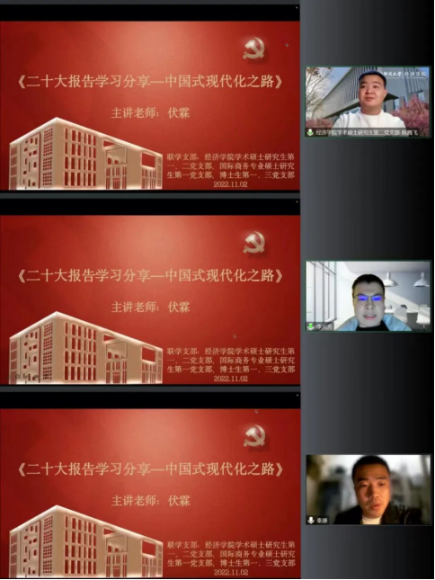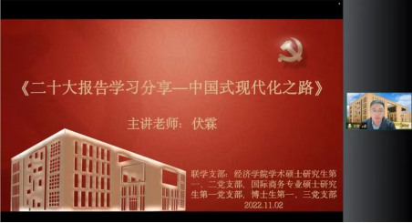 2022年11月2日,365英国上市集团党委委员、副院长伏霖为365英国上市集团学术硕士研究生第一、二党支部,国际商务专业硕士研究生第一党支部,博士生第一、三党支部作主题为“二十大报告学习分享——中国式现代化之路”的专题讲座。博士研究生第三党支部书记冯博主持活动,80余位师生党员及入党积极分子线上参加。