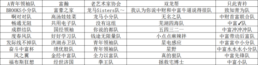3.每场比赛包含两支队伍,分别为正方队伍A队及反方队伍B队,每队选出一名首席经济学家(不一定是队长)以及确定队员A1-A4及B1-B4,并填写队员安排表。(队员安排表会在抽签结束之后于中富第二轮队长群发布,若因队员安排表的自行变动造成优秀个人的评选出错,组委会概不承担相应责任)