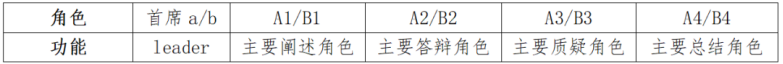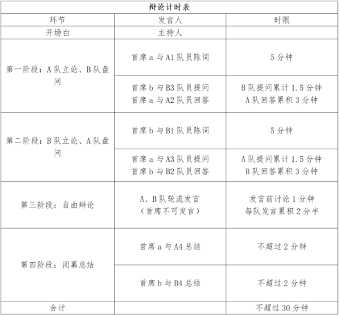 (注:以上所述a、b、A1、B1等仅为代号,用于方便评委打分;上述规定的所有时间将由计时员计时,在剩余时间30秒时计时员会给提示,5秒会进行倒计时。超时3秒以上则扣该轮次得分的10%,超时15秒强制停止发言,由计时员负责)