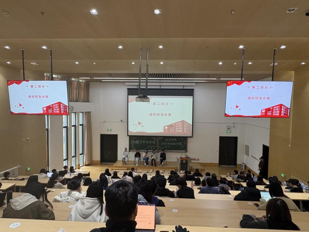 与此同时,在沙河校区学院楼11号楼跨越十年的对话主题沙龙同期举行。2011级经济学本科校友刘晓鹏、王超、赵婵媛、高丛珊、王雨欣代表毕业十年的校友与在80余位在校生共聚一堂,分享成长历程,畅谈职业人生。刘滨老师在致辞中表示,五位校友正本科毕业十周年,他们怀着回馈母校的赤子之心,愿将十年积累的感悟与经验传递给或许正处迷茫的学弟学妹,这份情谊令人动容,也彰显了时光的厚重与校友情谊的绵长。