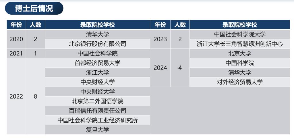 近五年来,学院高度注重博士生学术研究的就业引导,从数据看:33位博士毕业生选择国内知名高校任职(其中6人入职国内“双一流”大学),17位博士毕业生选择国内外知名高校的博士后岗位继续学术研究,15位博士毕业生入职国家发改委宏观经济研究院、国家信息中心等研究类事业单位,8位进入国家和地方机关单位工作,15位进入金融或国企的经济研究相关部门。除非定向之外,17位博士毕业生高校定向就业,11位博士毕业生在国家部委和大型金融企业定向就业。学院在博士生培养及学术就业方面取得了突破性进展。