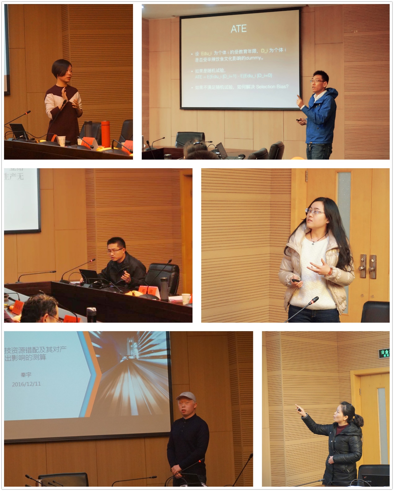 按照论坛安排,六位研究生顺次进行论文汇报。每位主讲人都作了充分的准备,精心制作了PPT,导师进行了专业的点评、提问,报告、答辩异彩纷呈。上半场由陈斌开老师主持,共有三篇论文进行了汇报——博士后邓鑫从独特的“辛辣饮食”角度研究《辛辣饮食文化与受教育年限》,赵雪婷博士则汇报了近期研究成果《金融市场的关联性结构变迁与系统风险外溢》,胡建辉博士对《环境规制、产业结构调整与绿色经济增长》进行了细致研究,蒋选老师、黄乃静老师分别对三篇文章进行了点评,并提出中肯的意见和建议。下半场由史宇鹏老师主持,硕士一年级韩冬雅同学汇报了入学后的研究成果《外群歧视与流动人口家庭收入》,秦宇博士对《我国科技资源错配及其对产出影响的测算》发表了见解,硕士生于也雯则分享了她对《地震灾害,风险承担和家庭资产配置》的研究成果。周战强老师、蒋选老师、陈斌开老师分别对三篇论文进行点评并提出进一步的研究建议。在场同学也积极参与提问和探讨,气氛热烈。