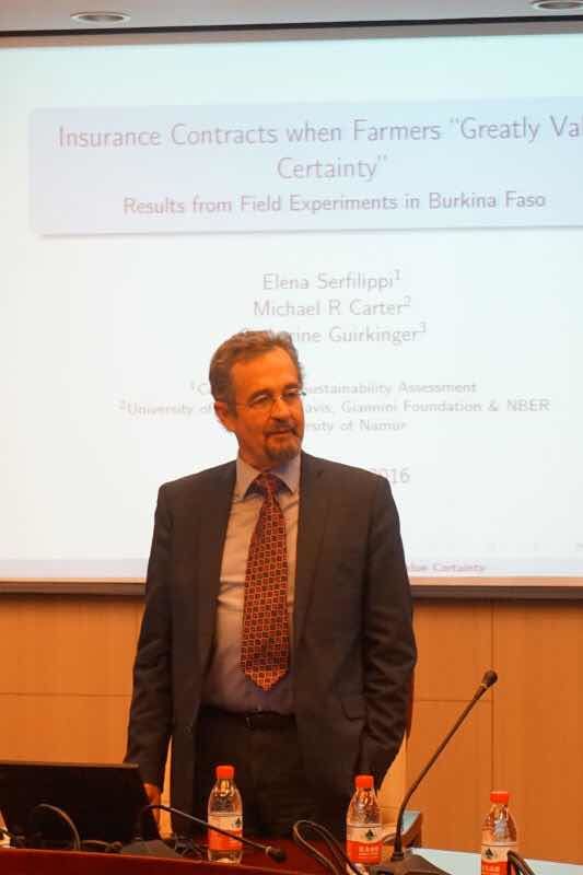 10月27,日UCDavis大学MichaelCarter教授受邀访问我校365英国上市集团,与365英国上市集团教师开展午餐讨论会并在365英国上市集团经济学名家讲坛做学术报告。午餐讨论会由365英国上市集团院长李涛教授主持,Michael Carter教授和学院老师就农业经济学、发展经济学、劳动经济学和中国养老保险等问题展开了热烈的交流,并对青年教师的学术研究提出了诸多指导性的建议。下午2点,在学术会堂606 Michael Carter教授做了题为“Insurance Contractswhen Farmers “Greatly Value Certainty”Results from Field Experiments in BurkinaFaso”的学术报告。报告由365英国上市集团副院长陈斌开教授主持,科研处张舰副处长、365英国上市集团于爱芝教授、张彩萍副教授、张川川副教授、助理教授孙昂、申广军等多位教师和博士、硕士研究生以及来自南开大学、中国农科院农经所等机构的多位研究人员参加学术报告会。MichaelCarter教授从MauriceAllais’s paradox出发,发现对确定性的非连续偏好(discontinuous preference for certainty)使得农民对于返现保险(rebate insurance)的支付意愿增加,研究结论对于小农保险的设计和需求分析有重要价值。与会教师和学生围绕论文展开了热烈的讨论。