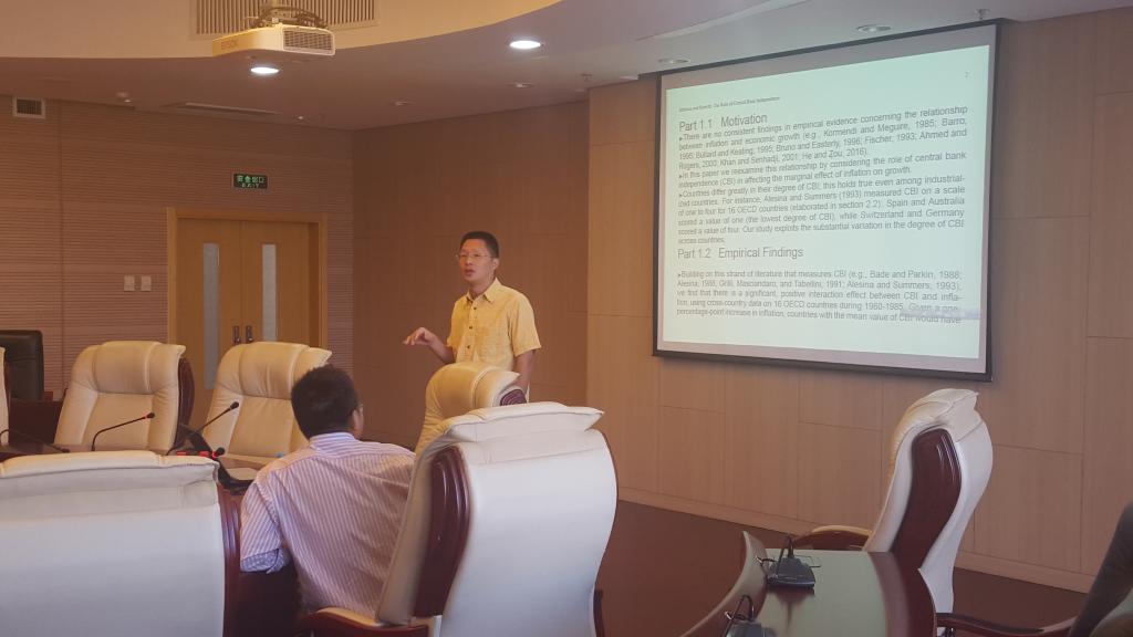 2016年9月28日上午,英国365上市公司官网中国经济与管理研究院的何其春副教授应邀在英国365上市公司官网学术会堂举行了一场学术讲座,何其春副教授的论文名称为:Inflation and Growth: The Role of Central Bank Independence。此次讲座在严成樑副教授的主持下举行,与会人员还有几位老师和学生。