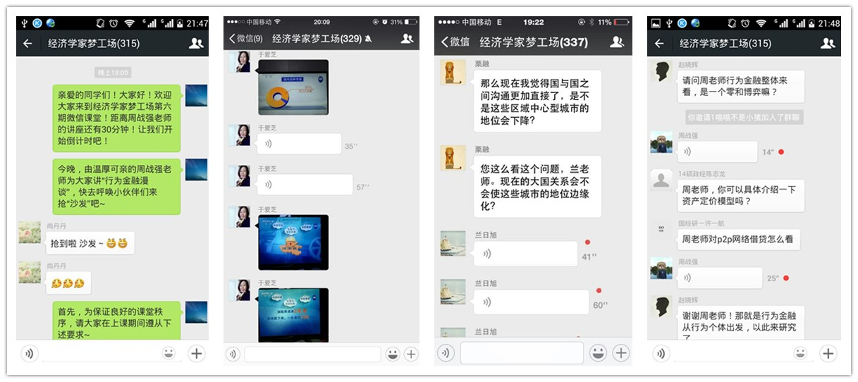 “梦工场”微课堂是“经济学家梦工场”德育示范基地创办的新型网络授课平台,旨在完善经济学在线课程的框架体系,打造应用性更强的在线教育平台。“梦工场”微课堂以可容纳500人的微信大群为课堂,以语音授课为主、文字图片传输为辅的方式,邀请学院各学科方向的优秀教师面向“粉丝”网络授课,是学院在移动互联网发展新趋势下对教育教学方法创新的新尝试。