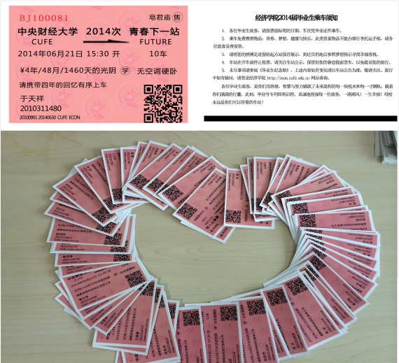 毕业是终点,亦是起点。为庆祝学生毕业,学院为每一名本、硕、博毕业生定制了寓意深刻、超级走心的“2014次”高铁车票,以“10车厢”寓意“10级”、以“学号”代替“车票编码”、以“无空调硬卧”调侃宿舍生活。而扫描火车票上的“二维码”将直接进入学院网站的创意,也提醒学生勿忘中财铭记经院;火车票背面的“乘车须知”则更温情,以满满的期望祝福毕业生稳健驶入“青春下一站”。