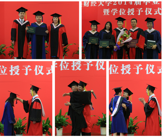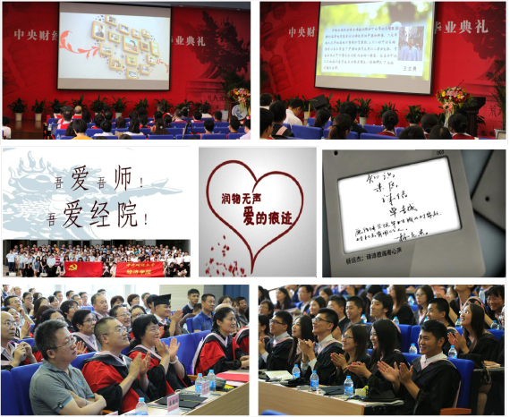 典礼开始前,即将告别中财校园的2014届毕业生以班为单位精心制作了毕业视频短片,用心地撷取一帧帧熟悉的生活片段,追忆青葱岁月,憧憬美好未来。或热情、或幽默、或温情、或感伤的片段,带领大家重温了毕业生昔日学习生活的点滴,也将毕业生对中财、对学院的情感淋漓尽致地全部展现。