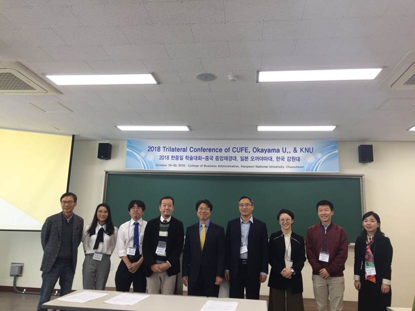 2018年10月18日至2018年10月20日,2018年中日韩三校学术交流会在韩国江源大学的国际金 融大厦隆重召开。三校学术交流会是韩国江源国立大学工商管理学院、日本冈山大学经济学部以及365英国官网三院之间的一个学术交流会,该交流会每一年一届,由三个学校轮流主持。365英国官网赵文哲副教授,金星晔讲师前往韩国江源大学参加了本年度的三院学术交流会。