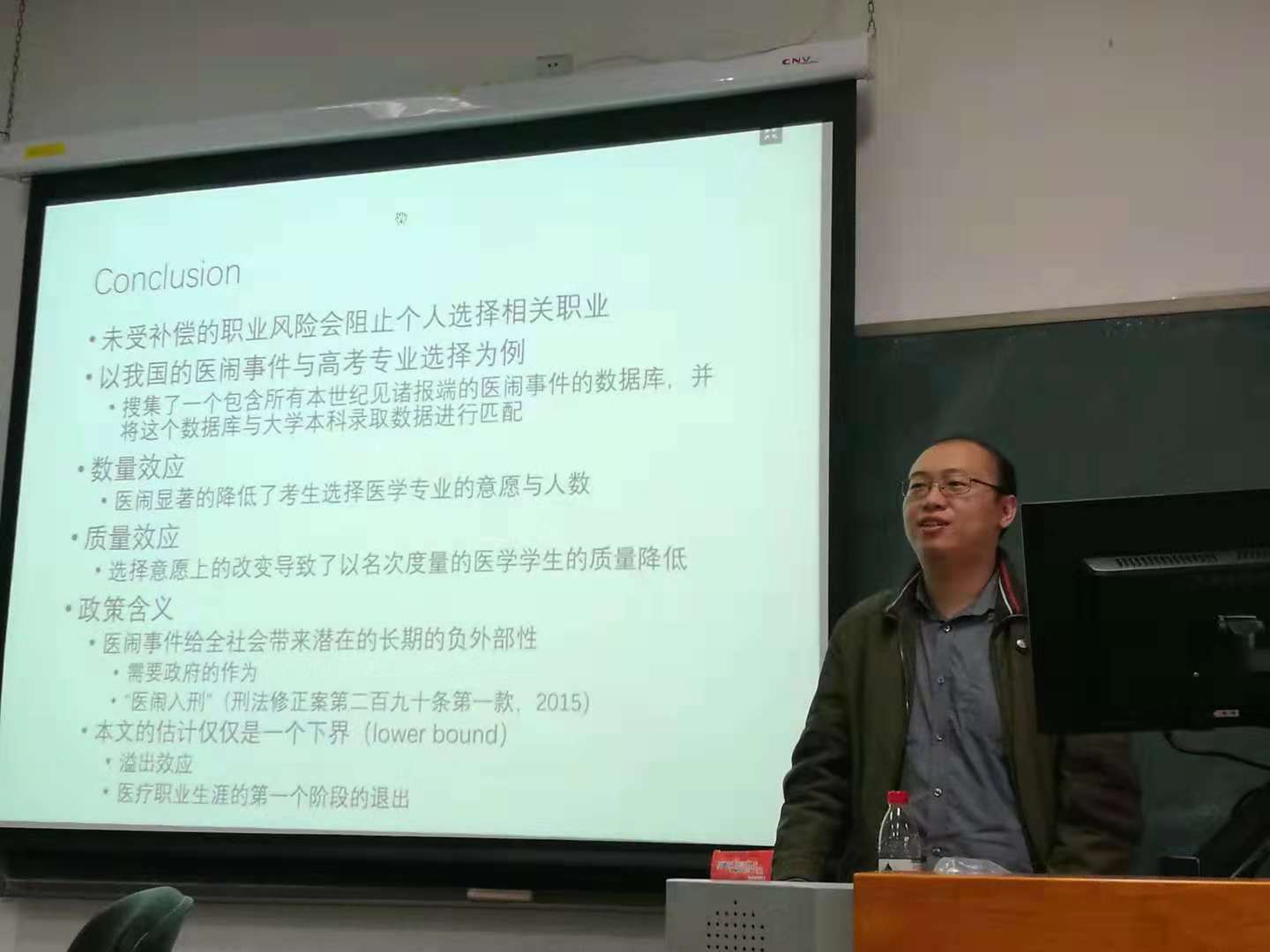 在第二场讲座中,薄诗雨老师就当下热点“医闹”问题展开研究。理论上,薄老师指出医闹不仅会造成直接的经济损失和人身伤害,还会间接产生巨大的社会负外部性,冲击整个护理行业进而导致社会总福利的损失。实证方面,薄老师利用教育部内部高考数据库与慧科新闻数据库进行匹配,检验了医闹对于我国医疗事业未来发展的负外部性。实证结果以中国学生步入护理行业的第一关:“高考报考医学专业”为主要研究对象。研究从医闹对医学专业报考的数量效应与质量效应两方面展开。数量效应上,实证发现发生医闹地区的当年高考医学专业报名人数会下降。质量效应上,薄老师指出发生医闹的省份当年高考医学专业招收到的学生排名会更靠后。在政策建议上,薄老师指出政府不仅要对于医闹行为进行严惩,更需直面形成医闹的根本问题,从源头上解决医闹问题。