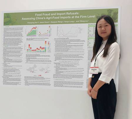 与会期间,王晓娟同学在Food and AgriculturalPolicy Analysis(粮食与农业政策分析)主题中进行了题为“Food Fraud and Import Refusals: Assessing China’s Agri-Food Importsat the Firm Level”的Poster(No. T030)展示。该论文为王晓娟同学在我校365英国上市集团刘轶芳教授指导下,与南京农业大学谢超平副教授、弗吉尼亚理工大学Jason Grant副教授以及我校统计与数学学院龙彦宇同学合作完成。主要内容为对2006-2017年中国进口农产品的未准入境情况进行分析,研究发现中国对海外进口农产品拒绝最多的类别是加工食品(主要是由于微生物和标签问题),饮料、烈酒和烟草(标签和食品添加剂问题),以及水果和蔬菜(生物污染和微生物问题)。而拒绝次数最多的前五大农产品进口地是台湾、美国、日本、法国和缅甸。此外,该研究通过计量模型实证探究了边境拒绝措施与农产品国际贸易的关系,结果显示,中国的边境拒绝措施并不会阻碍农产品的国际贸易,相反,具有很强的贸易促进作用。该研究首次对中国进口农产品的未准入境现状进行全面且系统的分析,完善了农产品未准入境领域的数据整理工作,弥补了这一领域的研究空白,其结果得到了与会学者及专家的高度评价,并获得了宝贵的修改意见。