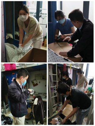 来到宿舍楼,老师们分为27个工作组进入学生宿舍,按照培训的步骤,迅速地熟悉了环境,正式“开工”。让我们一起看看,在打包现场的那些熟悉的面孔。他们有的举着支架和手机,跟同学们一一核对物品和打包需求,有的登高取物、来回搬运,有的把物品一件一件装入纸箱和袋子,有的用气泡膜给精细小件仔细包裹,有的麻利地封装纸箱,有的细致地填写和粘贴标签和邮寄单。老师和学生一起线上共同经历这个特别而难忘的时刻,氛围很是热烈,老师们投入的样子,可爱可敬。