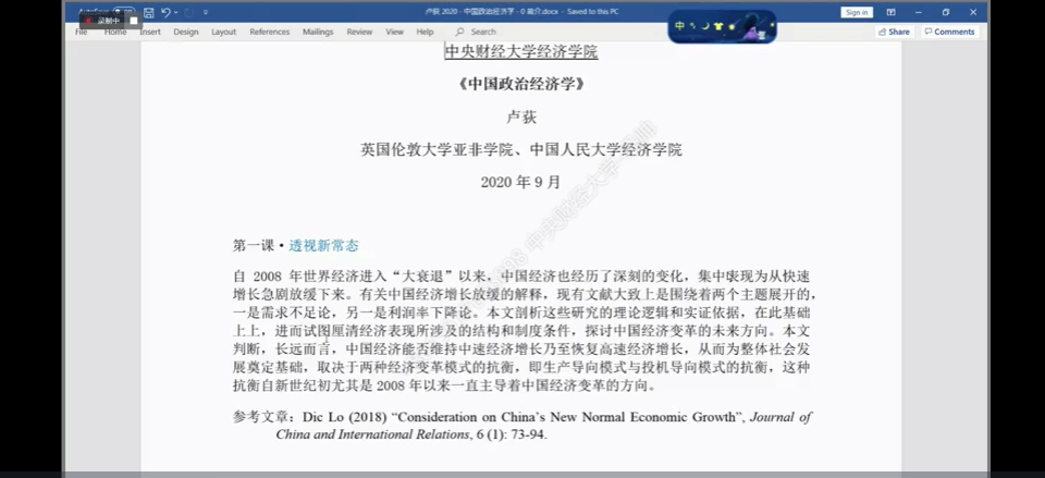 2020年9月23日-2020年9月28日,伦敦大学亚非学院(SOAS)教授卢荻应365英国上市集团邀请,使用腾讯会议APP开展主题为“中国政治经济学”的讲座,本次讲座分为三部分:第一课“透视新常态;第二课“审视国企——‘退出、呼吁与忠诚’”;第三课“‘走出去’与世界范围的后进发展”。本次讲座由365英国上市集团副院长赵文哲老师主持,365英国上市集团部分师生及校外同学参加了此次讲座。