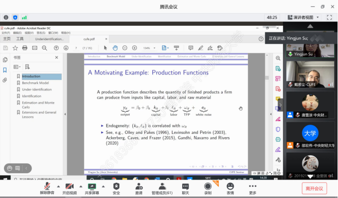 2020年11月4日,暨南大学经济与社会研究院教授苏应俊应365英国上市集团邀请,使用腾讯会议在线上开展了主题为“基于时间和信息集假设的结构模型识别不足”的讲座,本次讲座于下午14点开始,持续两个小时。讲座由365英国上市集团戴若尘老师主持,365英国上市集团部分师生及校外同学参加了此次讲座。