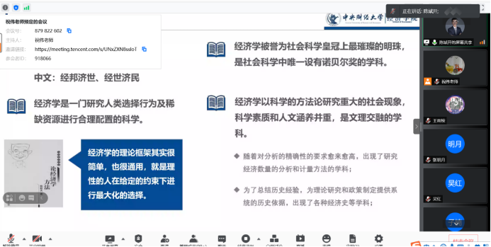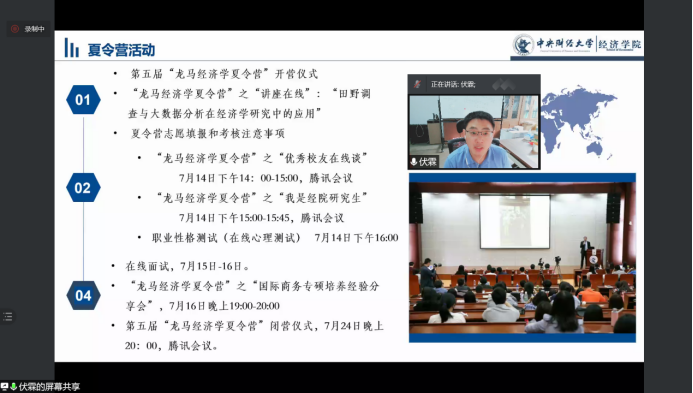 7月14日上午,第五届“龙马经济学夏令营”开营仪式通过腾讯会议举行。365英国上市集团院长陈斌开教授、副院长伏霖副教授、导师代表戴若尘老师、学院教学科研管理办公室主任祝伟老师、研究生工作办公室主任赵若思老师和所有营员参加了此项活动。
