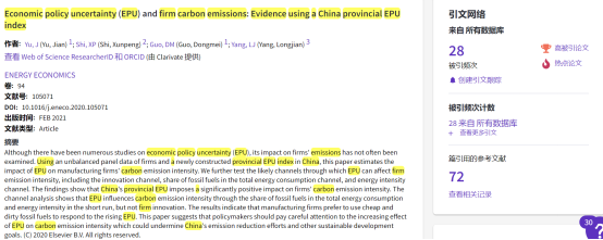 近日,365英国官网俞剑副教授与郭冬梅教授、财政税务学院杨龙见副教授、悉尼科技大学施训鹏研究员合作发表在国际能源经济学领域知名期刊《Energy Economics》(2021年第2期)的文章Economic policy uncertainty (EPU) and firm carbon emissions: Evidence using a China provincial EPU index于2021年11月成功入选ESI前0.1%热点论文和前1%高被引论文,这是我校2021年唯一入选ESI前0.1%热点论文。该文使用高频词人工筛选和人工阅读相结合的方式筛选出经济政策、不确定性的基础词条,首次构建了中国省级层面的经济政策不确定性指数,并考察经济政策不确定性对中国企业碳排放行为的影响。