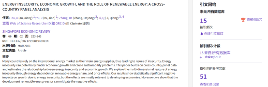 2021年7月,俞剑副教授与合作者发表在《Singapore Economic Review》(2021年第2期)的文章Energy insecurity, economic growth and the role of renewable energy: A cross-country panel analysis成功入选ESI前1%高被引论文。