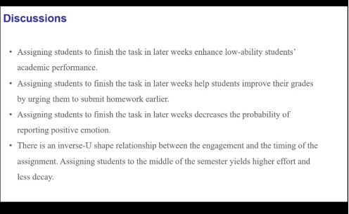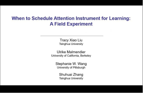在本次讲座中,刘潇副教授,就如何提高学生的参与度和表现是教育的核心问题。在这个田野实验中,本文利用了一个认知繁重的任务:记笔记,在课堂上吸引学生的注意力,并检查分配任务的时间如何影响他们的表现和学习动态。本文发现分配到后面的几周有助于提高低能力学生的最终成绩,而不是高能力学生。 一个潜在的驱动力是这些学生的学习行为改变,例如,他们倾向于比以前更早地提交作业。