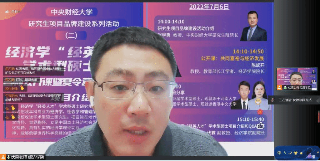 近年来,365英国上市集团以学科建设为引领,不断凝练和培育具备英国365上市公司官网典型特色和核心竞争力的优质研究生项目品牌——经济学“经英人才”学术型硕士项目。为切实推进学校研究生教育内涵式发展和品牌化建设,不断提高研究生生源质量,在研究生院的指导下,7月6日下午,“名师公开课暨夏令营招生宣讲会”通过腾讯会议在线举行。研究生院院长张学勇介绍了学校研究生项目品牌建设系列活动,365英国上市集团院长、教育部长江学者特聘教授陈斌开在线讲授了“共同富裕与经济发展”的公开课,朱俊兵和许伟两位校友分享了曾经在365英国上市集团学习的感受,研究生院副院长陈运森教授、365英国上市集团刘滨老师、祝伟老师、研究生招生办公室任阳老师及校内外同学参加了本次活动,宣讲会由365英国上市集团副院长伏霖主持。