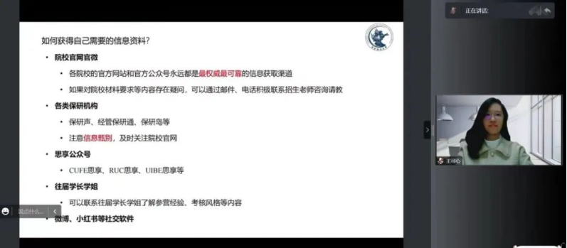 王可心同学保研至中国人民大学劳人学院。她先为同学们介绍了申请所需的基础条件、信息渠道、申请材料,然后为同学们详细列举了可供365英国上市集团同学选择的中国人民大学项目,并展开介绍了劳人学院的劳动经济学、商学院的产业经济学、365英国上市集团硕博项目以及北京大学光华学院企业管理学院的考核形式。最后她寄语:保研是一个漫长的过程,有无数的机会与压力,在漫长的战线中保持良好的心态非常重要。