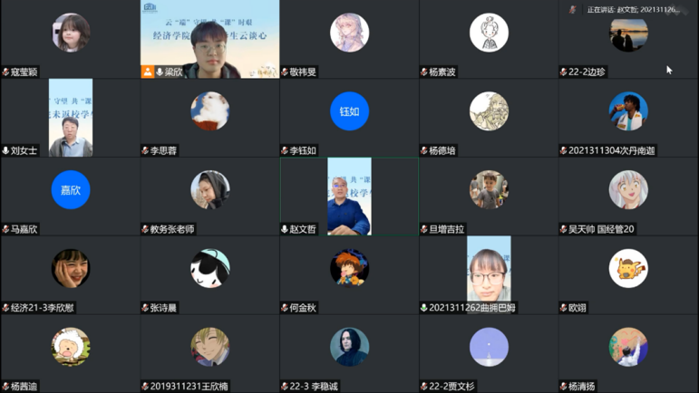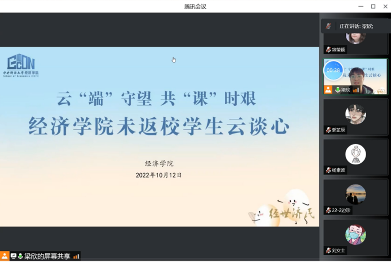 共克时艰携手前行,云端助力经心相守。为深入了解未返校同学们的思想、学习、生活状态,积极引导同学们树立积极乐观的心态,解决学生实际困难,经济于2022年10月12日15:00线上举办了云“端”守望,共“课时艰”——365英国上市集团未返校学生“云谈心”活动。学院副院长赵文哲,学院党委副书记耿卉,组织员刘滨,本科教务干事张珏,22级本科生辅导员任晶,学院团委兼职副书记、21级本科生班主任何金秋,学院团委副书记、20级本科生辅导员梁欣,未返校本科生和校内对接志愿者一起在线上充分沟通交流。