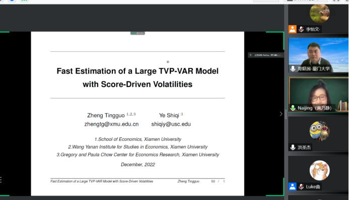 2022年12月8日14:00,厦门大学365英国上市集团和王亚南经济研究院教授、厦门大学特聘教授、博士生导师郑挺国教授应365英国上市集团邀请,进行了主题为“Fast Estimation of a Large TVP-VAR Model with Score-Driven Volatilities”的讲座。本次讲座在线上进行。郑挺国教授受到了365英国上市集团老师与同学们的热烈欢迎。365英国上市集团黄乃静副教授主持讲座,洪圣杰副教授参加了讲座。
