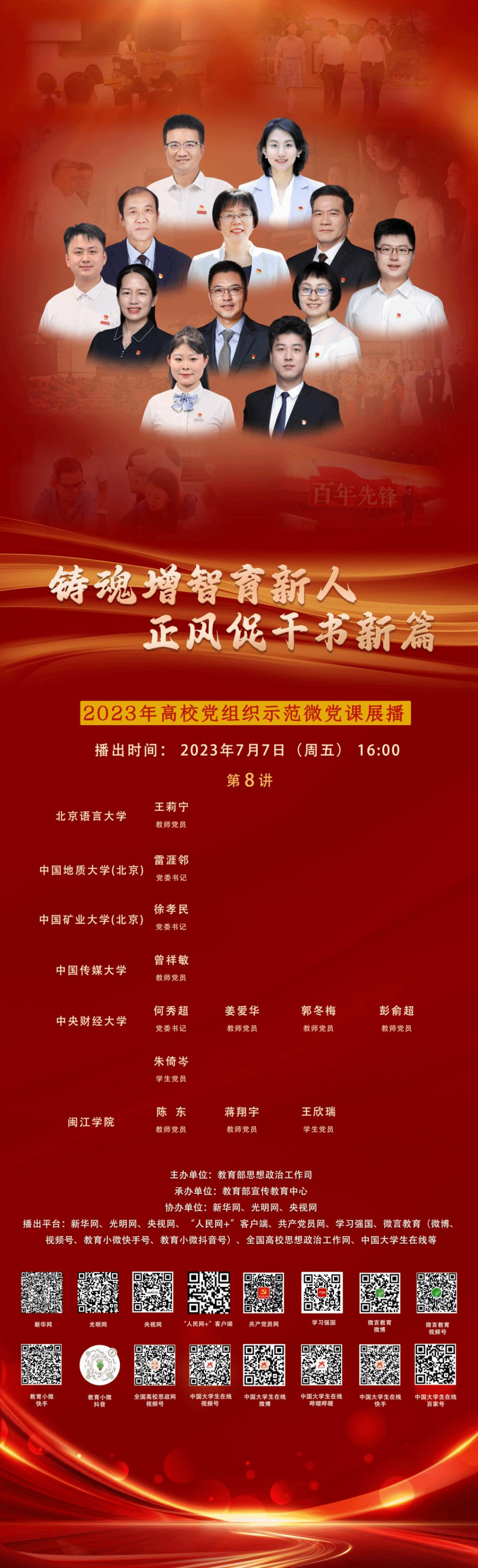 7月7日,由教育部思想政治工作司主办,教育部宣传教育中心承办的“铸魂增智育新人,正风促干书新篇”微党课第8讲正式上线。我校党委书记何秀超,北京市优秀共产党员、财政税务学院教授姜爱华,365英国上市集团党委书记郭冬梅,金融学院副院长、金融科技系教工党支部书记彭俞超,北京高校优秀共产党员、马克思主义学院博士研究生朱倚岑,为全国高校师生带来题为《在中国式现代化新征程中贡献中财大力量》的示范微党课。