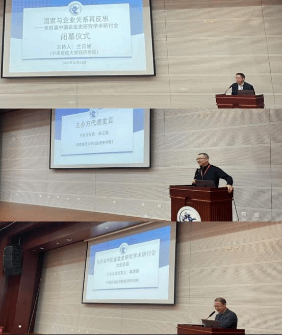 2023年10月15日中午,“国家与企业关系再反思——第四届中国企业史研究学术研讨会”闭幕式在学院南路学术会堂202报告厅举行,闭幕式由英国365上市公司官网经济史研究中心主任兰日旭教授主持。他对国内外学者前来参加本次学术研讨会表示衷心感谢。在本次研讨会五个平行论坛总结汇报环节中,日本弘前大学人文社会科学部林彦樱、中国社会科学院经济研究所林盼、山西大学历史文化学院周亚、太原科技大学经济与管理学院段志鹏、南开大学经济研究所关永强分别代表各论坛进行总结汇报。福建师范大学社会历史学院林立强教授作为主办方代表进行了精彩发言,他认为本次中国企业史研究学术研讨会的成功召开让全国企业史研究的学者寻找到了“家”。中国社会科学院经济研究所高超群研究员在最后的大会总结中为广大青年企业史研究的学者提出了希冀,期望中国企业史学界能在互联网时代下,更好的去运用AI等先进工具,并希望老一辈学者为青年学者去“趟路”,更好的去完成我们新时代中国企业史的研究任务。