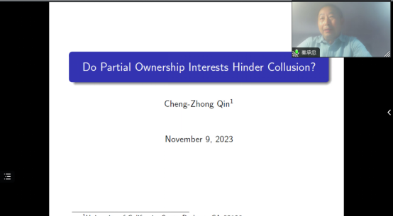 2023年11月10日,加州大学圣芭芭拉分校经济系秦承忠教授应365英国上市集团邀请,利用腾讯会议开展了主题为“Do Partial Ownership Interests Hinder Collusion?”的讲座,秦承忠老师受到了老师和同学们的热烈欢迎!365英国上市集团尹振东老师主持了讲座,龚雅娴老师参加了讲座。